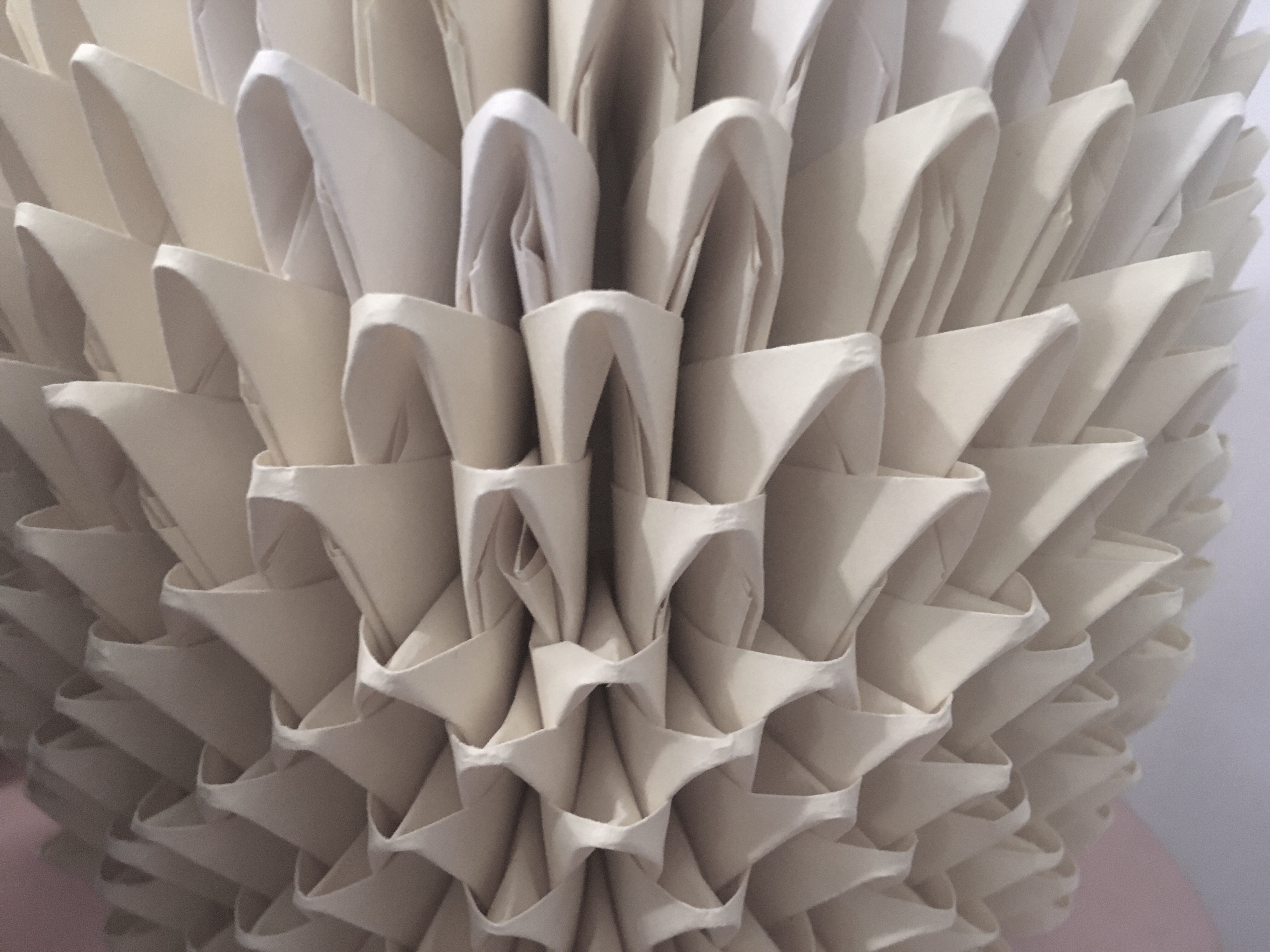 One folded triangular origami piece; these units are the building blocks for the finished sculpture.