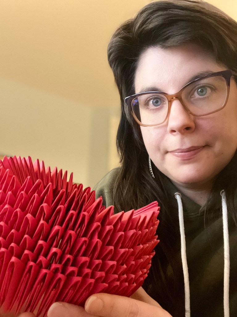 I have been very busy cutting paper, packaging folding kits, and mailing them to participants since July. By late December I had prepared and sent out over 137,000 pieces of red paper to over 320 people. I held monthly online workshops in the fall, co-hosted by The Soapbox and The Rotunda for 100,000 Folds. It was great to see some of you face-to-face and talk about COVID remembrance and origami. These workshops will start up again in March 2021, dates to be determined.